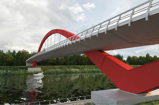 Vasily Desyatkov, head of the Moscow Department of Transport and Engineering Infrastructure Construction, stated that the new bridge will feature a grey color scheme with red accents, complementing the nearby Gagarinsky Bridge, whose arches are decorated in scarlet. It will also harmonise with the first pedestrian bridge across the floodplain – currently under construction on Ostrovnaya Street – which incorporates red decorative elements and an arched form symbolising wings. That first bridge will have a main span of 222m, with a combined design of support arches inclined at 25°, and a total length of about 500m including approaches.
