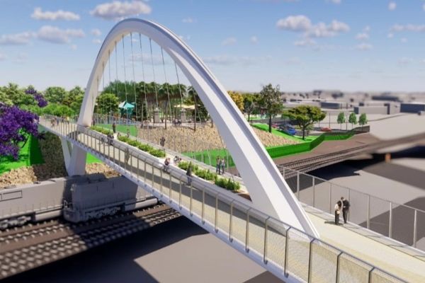 The bridge will give public access to Wilmington Waterfront Promenade via a signature bridge over a railway line. The structure, designed by TYLin will be a concrete cable-stayed arch.