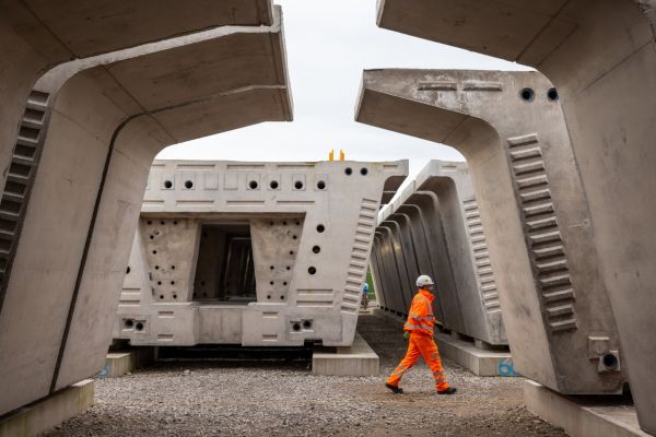 The concrete segments in a holding yard dwarf a contractor. Credit: HS2